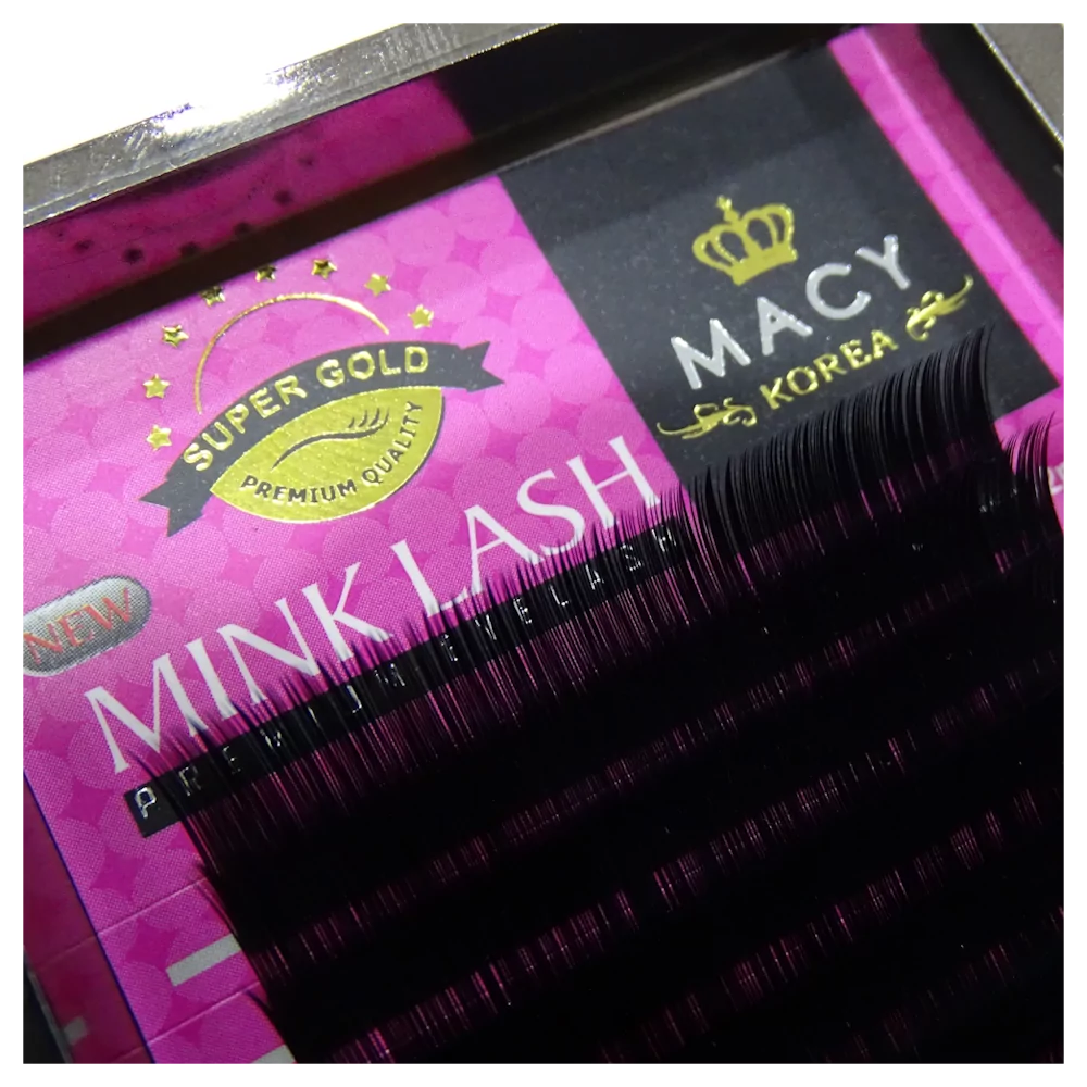 Silk eyelash extensions, premium quality gold series, intense black with very soft touch and glossy finish. MACY
