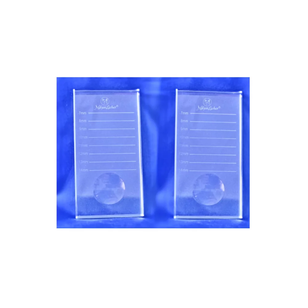 Transparent glass of 10x5cm. where you can glue the strips of eyelash extensions by length number and you can also deposit the drop of glue directly on the hole made in the glass or place a sticker. 1und.